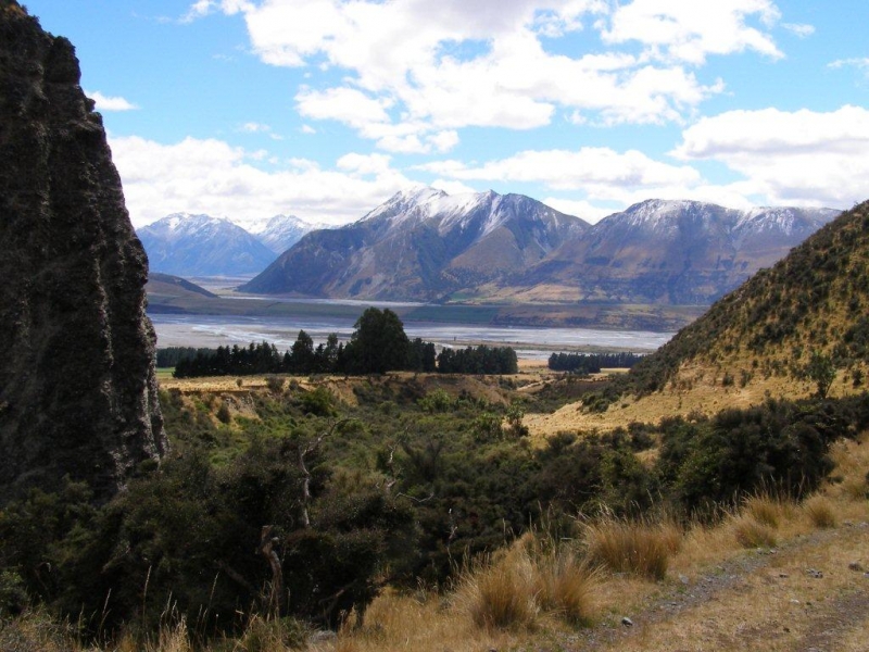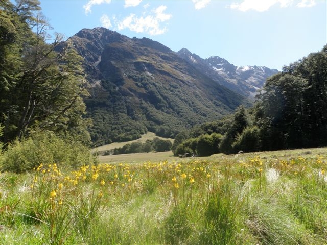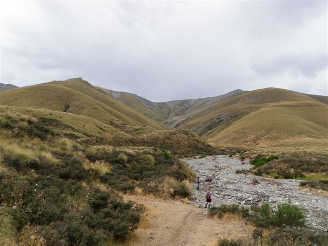 The two 4wd vehicles with seven trampers arrived at the bottom of the track to the Dingle Saddle at around 10am on Saturday, after a 2 hour drive up the Waitaki and Ahuriri Valleys. The climb up the well-graded zig-zag track to the saddle (thanks Maurice) took 1 ½ hours. A pause for an early lunch and to take in the extensive views was followed by the one hour descent to the Dingleburn Valley floor. The track down initially sidled at an angle to the south, then turned steeply down a ridge, the last section being through beech forest.