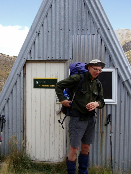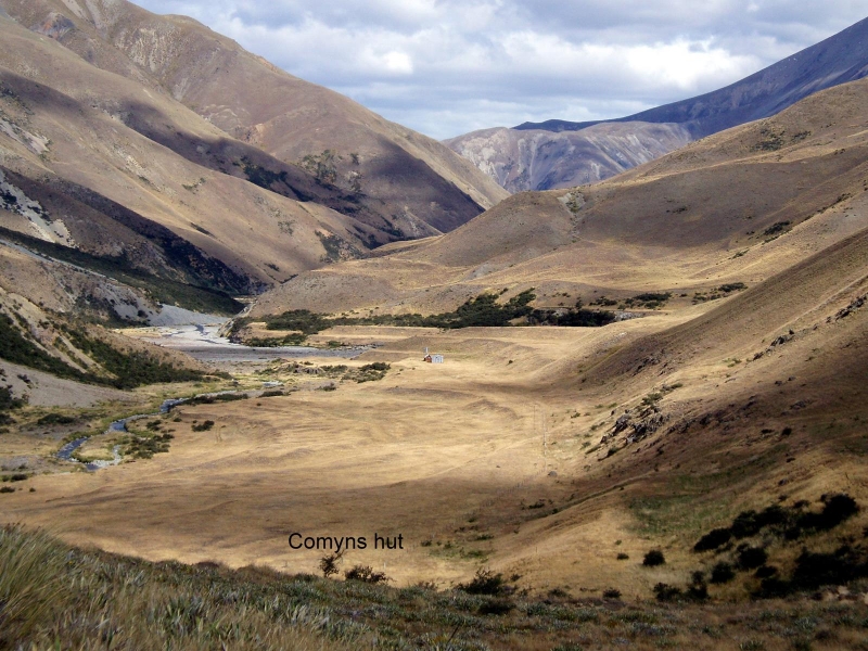 After dropping off the team at Glenrock Stream easement the vehicles returned to Redcliffe Stream carpark where one was left for our return on Sunday. Back to Glenrock Stream Bill and Maurice set off to catch up on the advance party who were having lunch on the side of the track in the sun. The 4WD track took us into the conservation area with Turtons Saddle looming before us. A series of zig zags on an easy gradient brought us to the summit where a very cool breeze made our stay brief despite the wonderful views of down the Rakaia Valley. A skiff of snow coated the tops but the sun was still shining. It was downhill to “A” Frame hut where we passed a mountain-biker grinding up hill after a day trip into Comyns Hut. As we descended to the river terrace of the North Branch Ashburton River, Comyns Hut came into view and soon we were resting with a brew at this old 8 bunk station hut after almost 6 hours tramping. With no one else arriving, tents were not required and the cool evening had us in our sleeping bags early and for those slow to sleep, listening to the array of noises from within the hut.