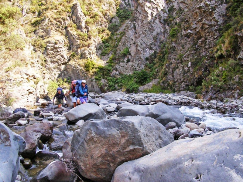 A new day arrived and with it clear skies for our venture down the river. All packed and away by 7:30am the forward scouts found an old bulldozed track on the true left which we followed where possible and then the many crossings began.