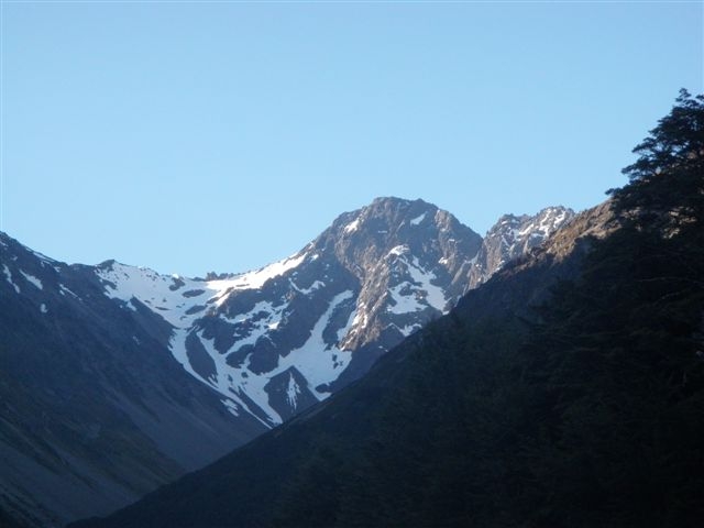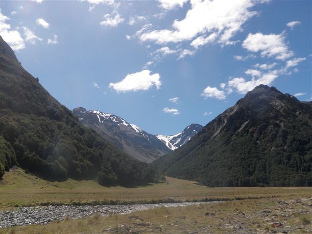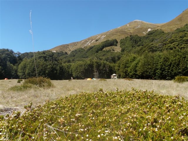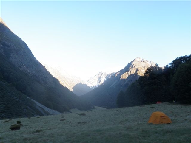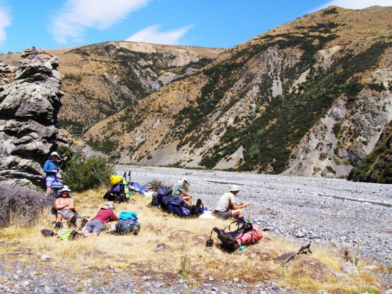 It is always quite exciting not knowing what awaits you around the next bend, as the river enters the gorge section but with river levels low and water warm enough, the journey was enjoyable. Leaving the gorge section, progress improved and 5 hours later, Cookies Point was reached. A lunch break was taken by the big rock away from the nearby seagull colony. (Can’t be too careful). The day temperature had returned to Summertime and a very hot trek crossing where necessary up the Swift River to Tribulation Hut, our destination for the day. As it was only 3pm it turned into a leisurely afternoon, bathing in the river and then resting in the shade. The six bunk musterers hut has been renovated providing a tidy basic shelter for five of our party. Two tents were erected for the night with Jane testing her new tent for the first time. It was a perfect night with a clear starry sky, full moon and a very light breeze. How the weather can change within 24 hours.