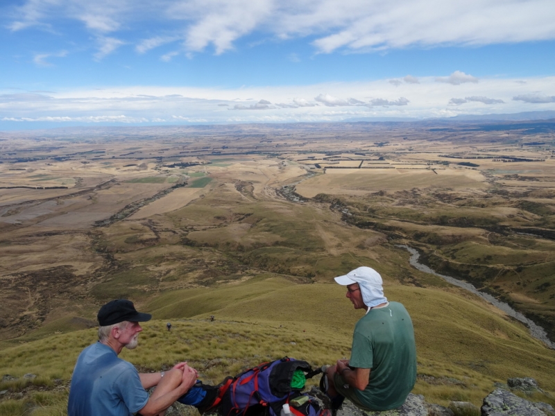 Sunday morning saw a leisurely breakfast and packing up, setting off around 8am up the steep 1 ½ hour climb to the saddle. There, packs were dropped and we headed north along the ridgetop for about 2 ½ km, stopping on a knob just above a small tarn. There we spent some time taking in, and photographing, the stunning million-dollar panorama extending from the mountains of the Barrier Range to the east, across the top end of the Ahuriri Valley with Mt Huxley at its head, Canyon Creek and the snowy bulk of Mt Barth, to the head of the Dingleburn and its saddle overlooking the Hunter. To the south extended the ridge, including Mt Gladwish and Puke Makiriri, which separates the Dingleburn and Ahuriri valleys. A return to the saddle for lunch preceded the one hour descent down Morrie’s Motorway back to the vehicles and then home, with an ice-cream stop in Omarama.