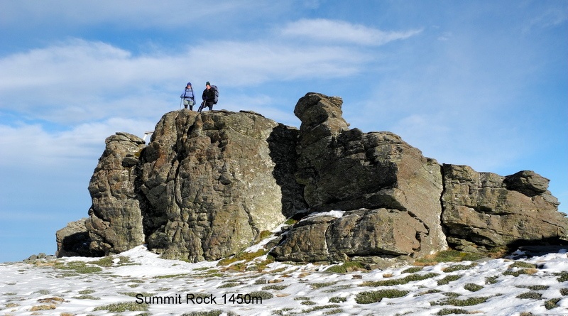 From the hut we went straight up to the top of the range from the first gut, and proceeded to Summit Rock on a thin layer of snow with a now very cold wind but good views in all directions.