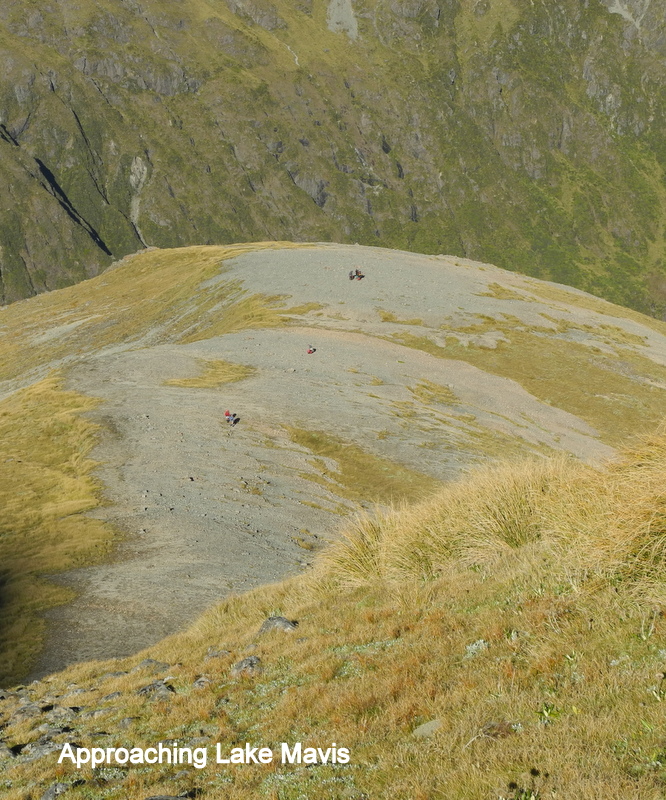 An early lunch was enjoyed in the sunshine at the Mingha Biv. The clever graphics on the inside walls of the biv were photographed and we were off on the last lap to Goat Pass Hut, arriving five hours after our start – a gentle way to break into the tramp. With the hut to ourselves, brew in hand and sitting in the sun life was as good as it gets. Later after a short walk across snow grass from the hut and up to a high point we were rewarded with great views up and down the Deception River and across to the tops above Temple Basin. We could also see our intended route up to Lake Mavis for the next day. As the day wore on more people started to arrive and by the evening there were at least thirty looking for a bed in the twenty bunk hut. It was interesting to note that a good number of these people did not have any form of bed mat. Lessons to be learned here.