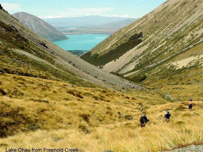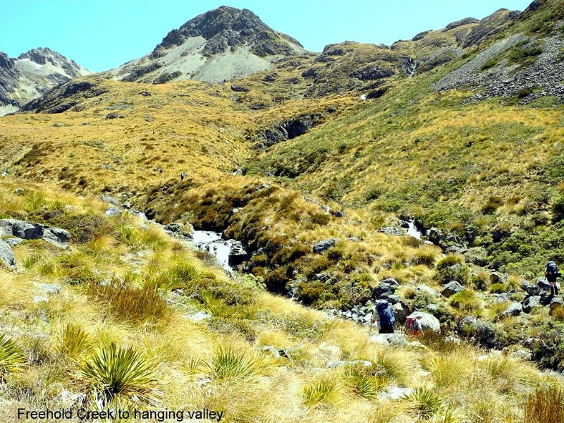 We had a short chat with some cyclists enjoying the new A to O track before continuing our way to Freehold Creek. The track up the true right was in great order after a lot of windfall had recently been cleared. An hour of steady uphill to the bush line brought on an appetite for lunch and a view of the route ahead to the hanging valley above.