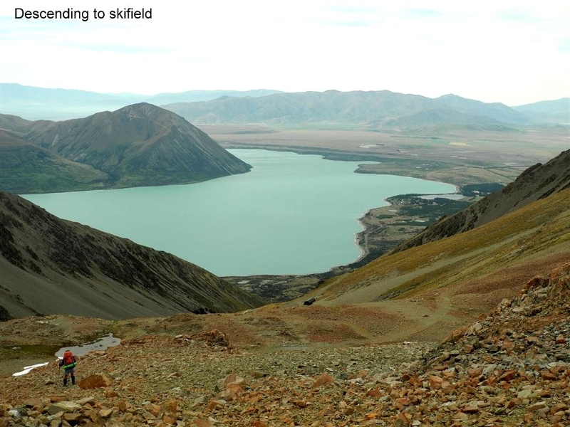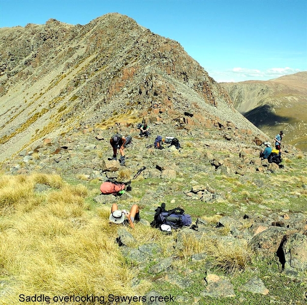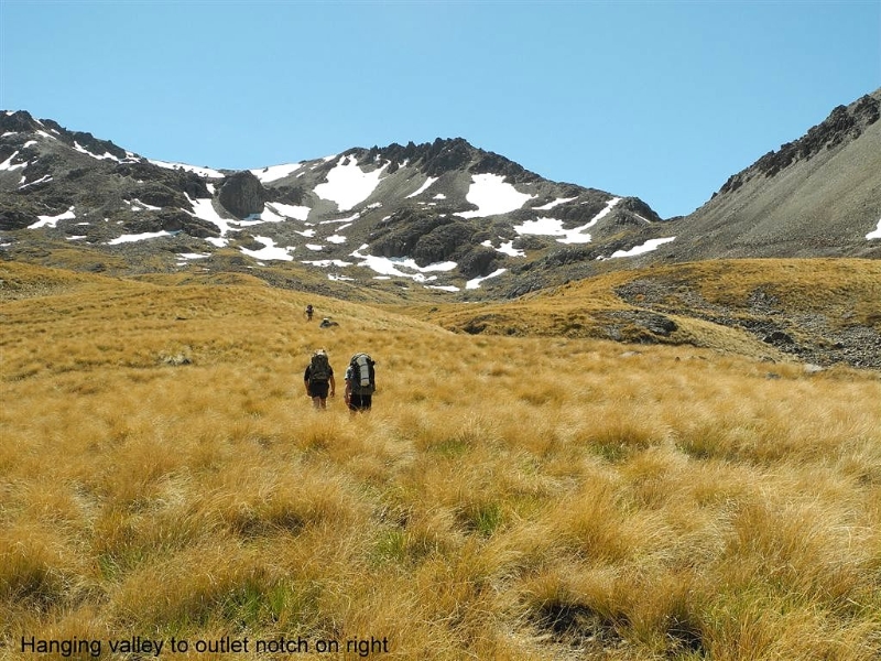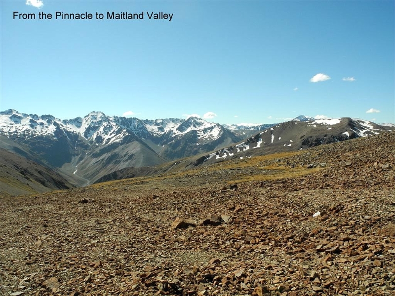After some discussion on alternative routes out we decided to take the notch overlooking Sawyers Creek. Another break was taken on the saddle in fine calm conditions, then it was a rocky sidle to a snow patch crossing with some more sidle to Pinnacle where the Maitland Valley came into view.