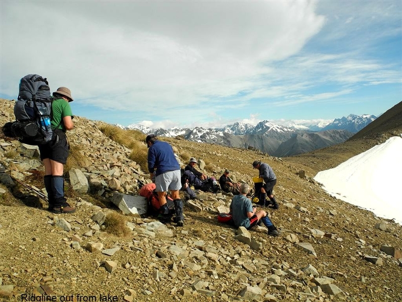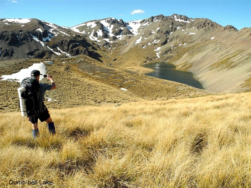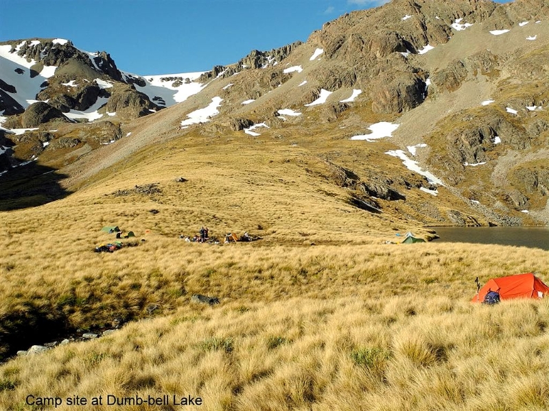 Dumb-bell Lake finally appeared as we descended the tussock slope to the lake outlet where a tent city was erected. Pleased to be there after a hot days travel we soon settled in, pots bubbling and the smells of various dinners on the go. The perfect evening beside a sun drenched lake with great company. Before darkness the call to recharge the batteries came and human silence fell over the site. The sound of the outlet stream soon had me in dream world.