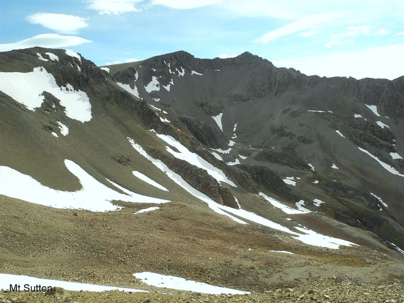 With the light of the new day we were all up refuelled and ready to go by 7.15am, some a little more so than others. It was a short walk up valley before crossing the stream, then up to the ridge line leading round to Mt Sutton 2007m. A cold wind on the exposed ridge kept us moving on to the summit which once again gave us splendid views all round.
