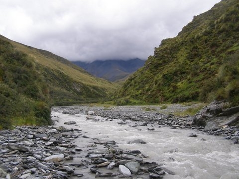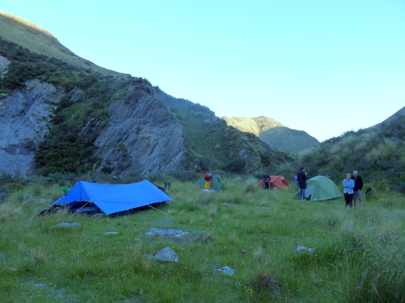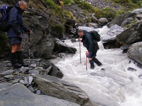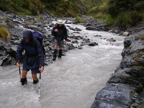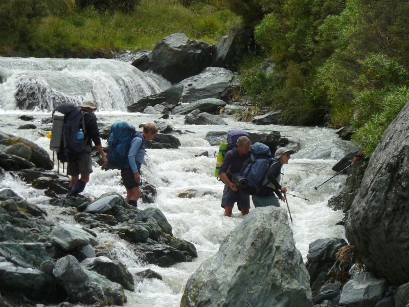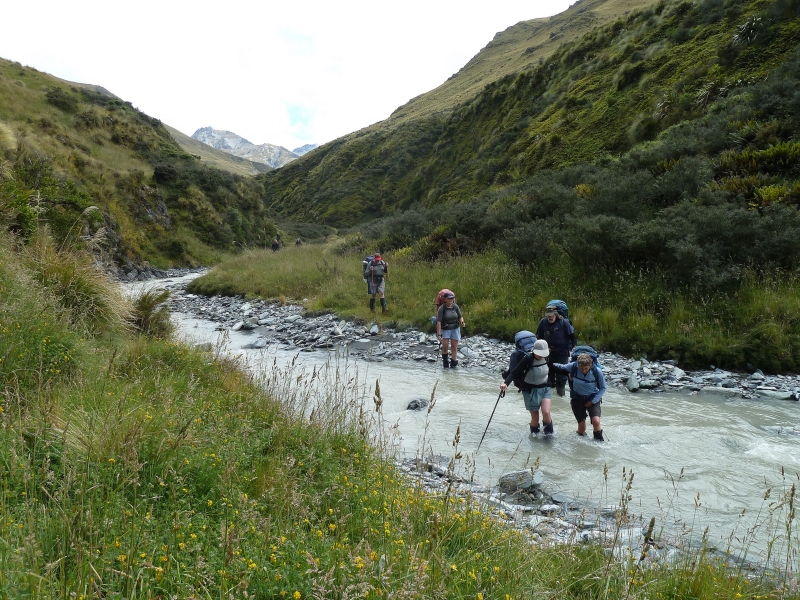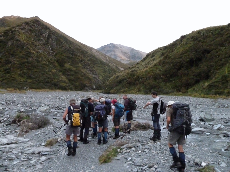 The wander back to the hut became a very strung out affair and while a brew was being enjoyed someone noted we were one person short. “Not to worry. He will have walked right past the hut as many others have done in the past”. So we pick up his sleeping bag etc and head off down valley expecting to find him returning after he had realised he’d gone too far. But no sign of him, all the way back to the cars . With the creek running a lot higher than it was yesterday there was suddenly a very different atmosphere as a small group of the most experienced trampers headed back upstream. The search was short-lived however, as the missing tramper was met just five minutes later coming towards us. He had apparently missed the hut and turned around just as we had predicted but missed the hut a second time just before we set out down the stream.