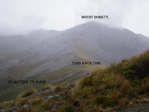 An attempt was made by 13 trampers on the Mt. Domet east face in mid January. Although there was an early start from Chinamans Hut, by the time the half way saddle was reached, thunder, rain and lowering cloud had set in, so it was agreed to abandon the climb. A discoloured rising river had to be negotiated many times on the way back to the cars.