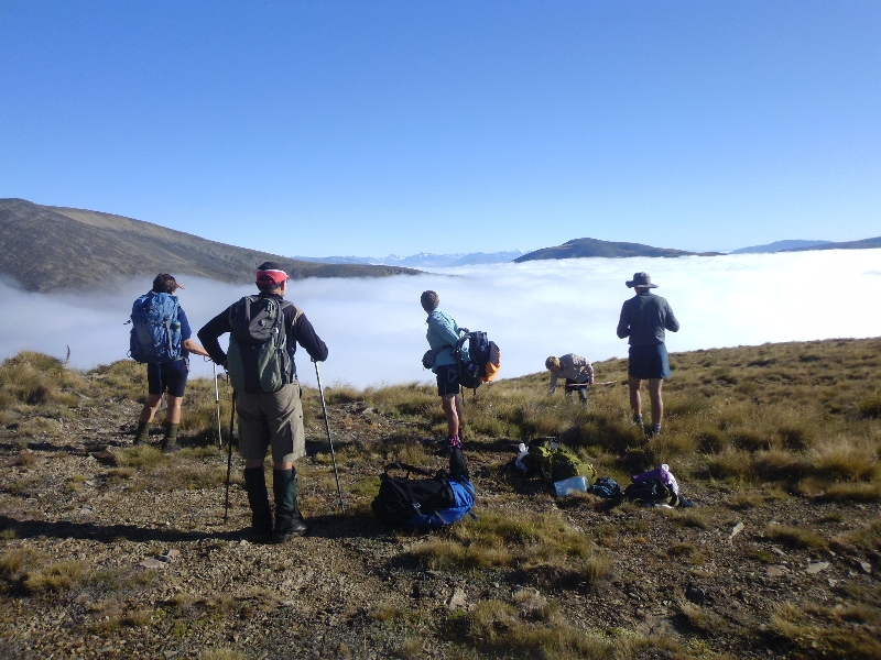 The alarm went off at 5.30am, all packed up and ready to go we started out just before 7 in low cloud. We followed a 4 wheel track up the ridge for about two hours, and at a height of about 1600m the cloud opened up and the views just got better and better. It was like diving into the other direction, another world up there! In bright sunshine and a bit of a breeze we carried on upwards. As it turned out a boundary fence on the ridgeline had been taken out by big machines, evidence being holes all along the upper track, fence posts and loose wire and ongoing 4 wheel drive track nearly up to the top. With rocks and some interesting rock formations this part looked like the surface of the moon! We arrived at the top after 4.5hrs of walking, just right for lunch!