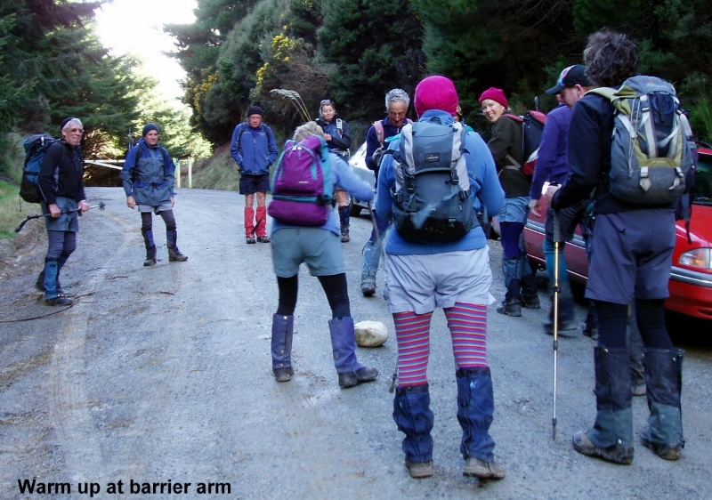 After a very wet Saturday, I was pleasantly surprised to see a big improvement in the weather on Sunday as nine trampers left the Oamaru carpark bound for Silver Peaks, stopping on the way to pick up two more at Maheno and then meeting a further two at the Double Hill Road intersection.With the cars parked at the locked barrier, a few showed their skills at kicking a flat rugby ball around which had been dumped along with other rubbish on the side of the road. Not a pretty sight.