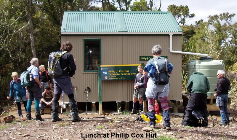 A five kilometre road walk bought us to the start of the Tunnels Track.Underfoot was wet and slippery on the steep descent to the Waikouaiti River South Branch but most were able to stay upright. After the below knee-deep crossing of the river we made our way up the ridge through the trees and bush until we came to the new 4 bunk Philip Cox Memorial Hut where we had No1 lunch at 11:45 am. It is a delightful hut and a fitting memorial to a well-liked man who was known to some of the members of the party.