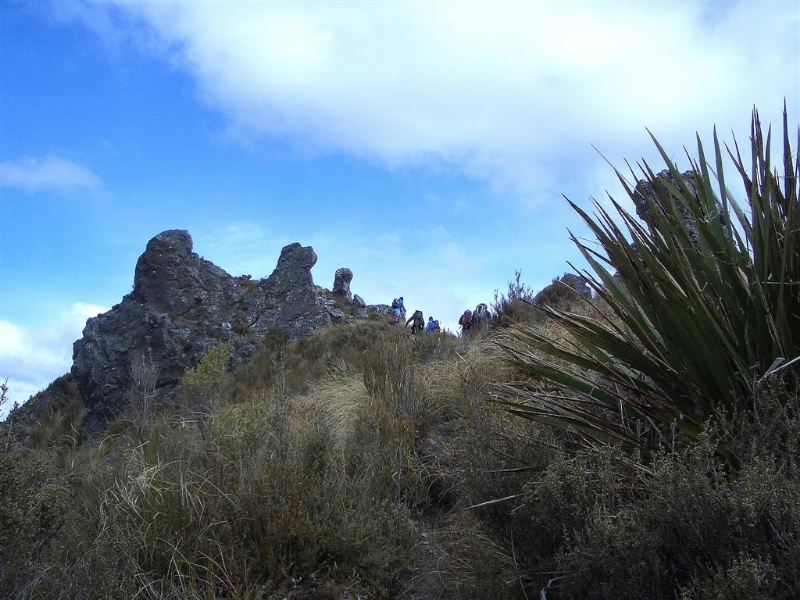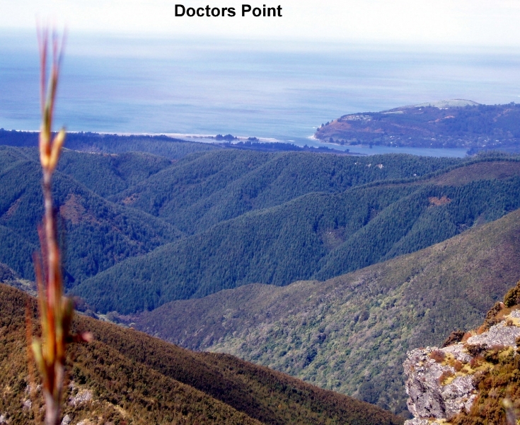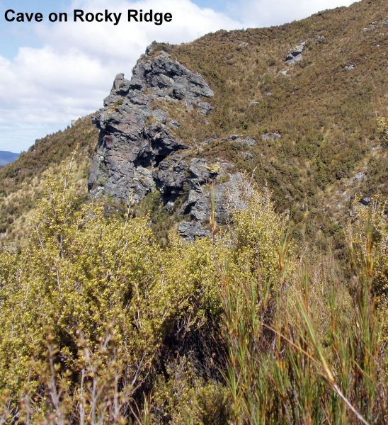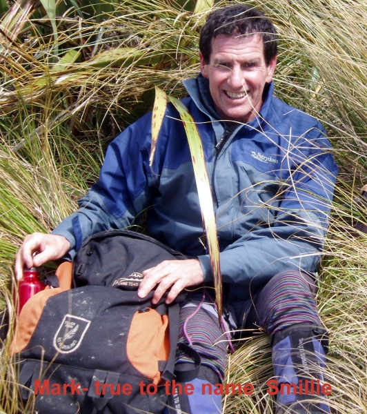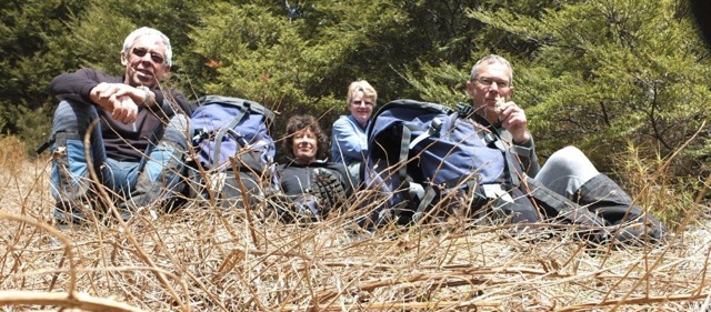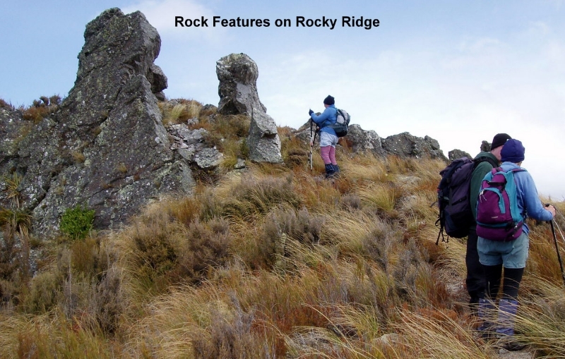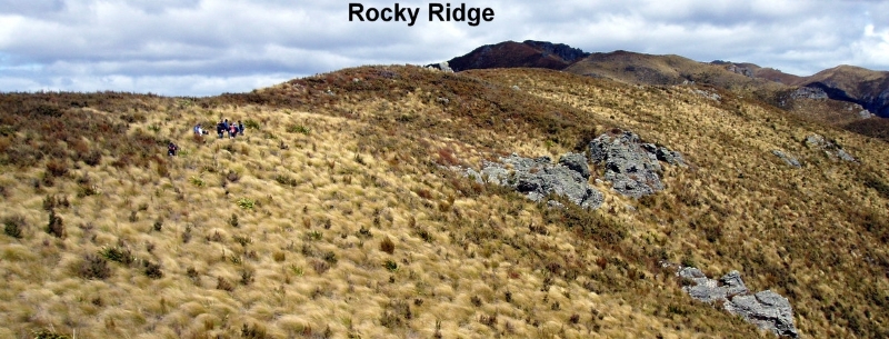 Lunch No2 was taken in the tussocks out of the wind. Later after leaving the ridge, we passed by Pulpit Rock and on towards the Green Hut site for a quick rest stop and snack. The wind had calmed down considerably by now.