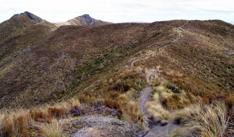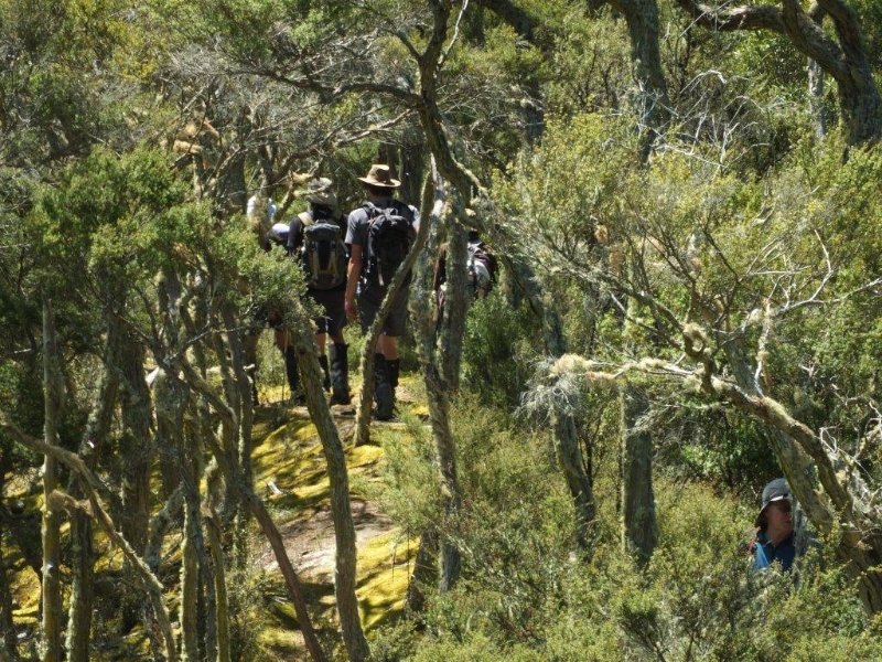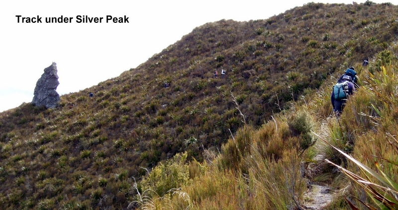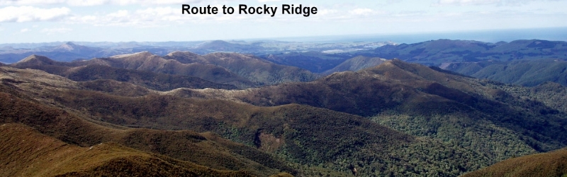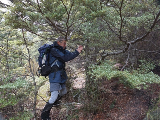 We climbed a bit further up the hill to the exposed ridge, and then dropped off to a long sidle to push through a route leading into the upper bush part, which eventually gives way above the bush line to the route to Maitland.