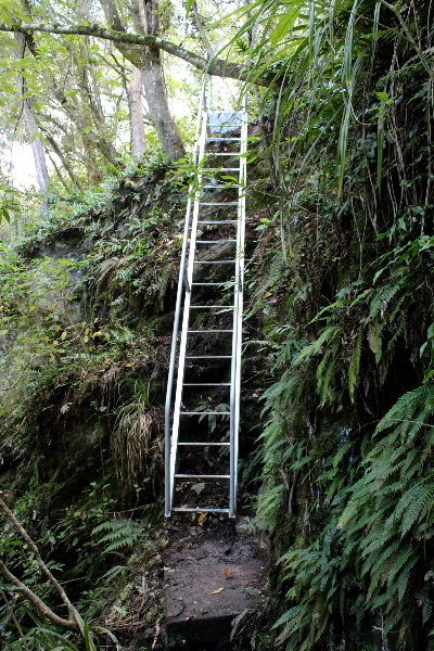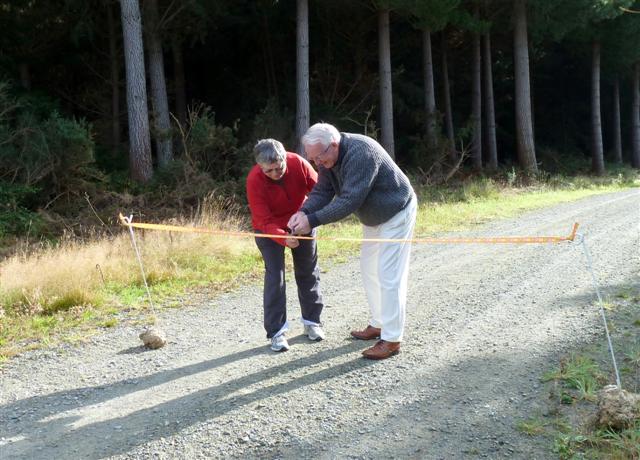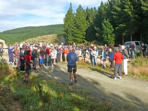 The Hoods Creek Track in Herbert Forest was reopened in brilliant weather on the 15th April 2012. Before a crowd of about 90 people Waitaki District Mayor Alex Familton, and Tramping Club President Bronwyn McCone cut the ribbon to mark the occasion. It was the culmination of many hours of work by Club members to reopen the track which had been closed since the Cave Creek tragedy with the removal of a walkway around the waterfall.Pivotal to the reopening was the construction and installation of a steel stairway up the waterfall bank.