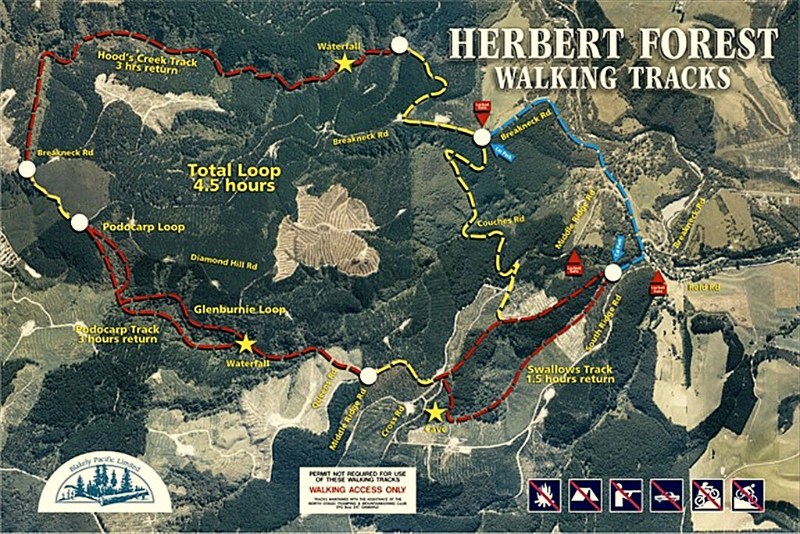 All Herbert Forest Tracks are open to the public, and maps are displayed and available for self guiding at the forest entrances at Swallows Loop track and the end of Breakneck Road. Please return the laminated map to the box when you return.