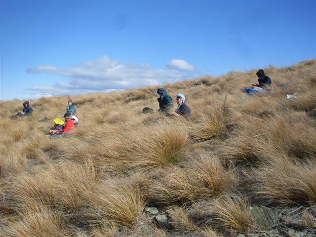 Eight of us met at the car park on a fine morning, with a forecast for strong winds and late rain. We got ourselves into two 4WDs and headed off though Danseys Pass. We stopped at the Danseys pub to wait for the other vehicle to catch up and then it was on to Little Kyeburn Rd and Mt Buster Rd to the D.O.C car park. It was lucky we took the 4WDs because there were two fords to go though on Mt Buster Rd that low 2wd cars would have had trouble with.At the car park it was a wee bit windy but not too bad, so we picked the ridge we were going to go up and headed off on our climb. The climb was not too bad apart from the tussocks that we had to push though; they were quite big in places. The higher up we got the more the wind picked up and when we got to the top which took about two hours it was blowing a gale. We tried to find a place out of the wind to have lunch, but this was not easy. Robbie found a place, it was not the best but we had some shelter if we got down low.