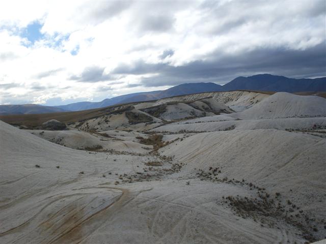 The Buster digging is a huge area that is probably 10km long and half a km wide. They stand out because the tailings quartz gravels are white and they look out of place within the tussock countryside. The diggings were mined from 1860s to the 1930s and were the highest altitude gold workings in N Z at 1200m.