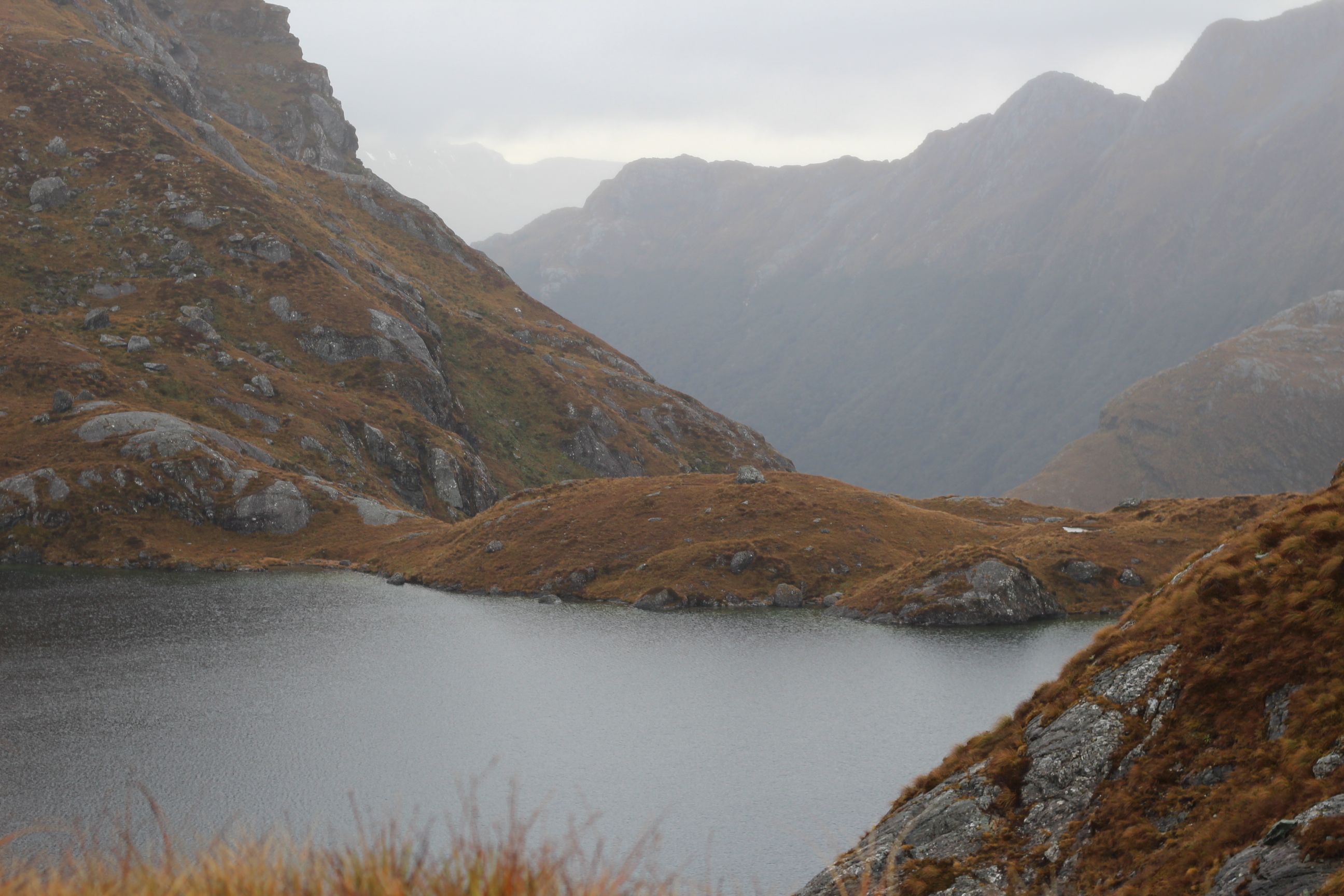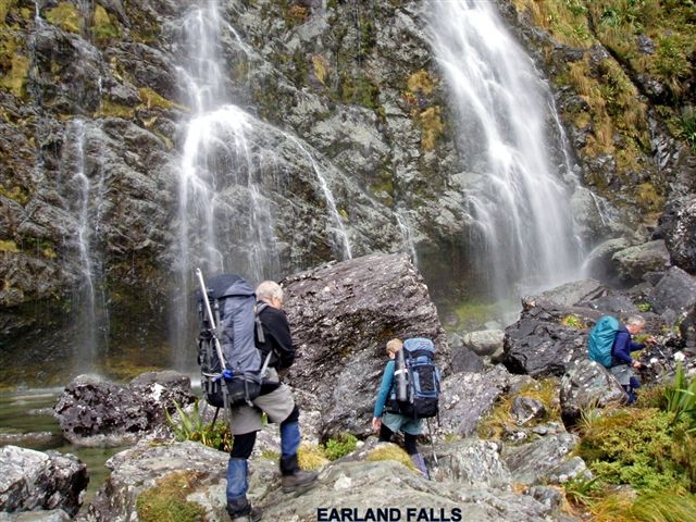 At 8am on Thursday, five members left Oamaru on their way to the Routeburn Track Shelter near Glenorchy. After stopping for a break and early lunch at Cromwell, we arrived at our destination after mid-day. Conditions were overcast as we made our way towards the Routeburn Flats Hut, passing a new toilet on the side of the track after about an hours walking.A leisurely afternoon tea was taken here before ascending to the Routeburn Falls Hut, our home for the first night.. Upon our arrival we were met with a kitchen filled with black smoke. A couple had lit their stove and it had gone on fire along with a litre of fuel. Thank goodness for metal benches as the result could have had serious consequences.We later watched in awe of the precision in lowering building materials by helicopter to the construction site of the guided walkers’ accommodation which is being enlarged to cater for over forty clients. A lone kea was seen near the hut in the evening.Friday morning was misty around the tops but we still had clear views of the waterfalls, Lake Harris and the stunning scenery in the upper basin. We decided not to climb Conical Hill from the Harris Saddle as the views from the top would have been poor. Instead we sat in the public shelter and had morning tea. From here the track has been re-routed, passing several tarns and then linking up with the old track to traverse the Hollyford Faces. Fog hung in the valley below so we were unable to see Gunns Camp and the secenery in the Lower Hollyford Valley. The sun appeared briefly as we arrived at McKenzie Hut in time for lunch. Alterations here were also being carried out on the guided walkers’ accommodation as we wandered on passing another toilet on the side of the track and then on to Earland Falls and Howden Hut. Five DOC staff were waiting for a helicopter to come and pick them up after having spent the last few days there replacing the warden’s quarters with a new roof and replacing the hut windows with double glazed ones. We again watched as the pilot carefully winched up the old windows and repositioned some large containers and fadges. The workers were then taken out to the Divide to drive back to Te Anau.