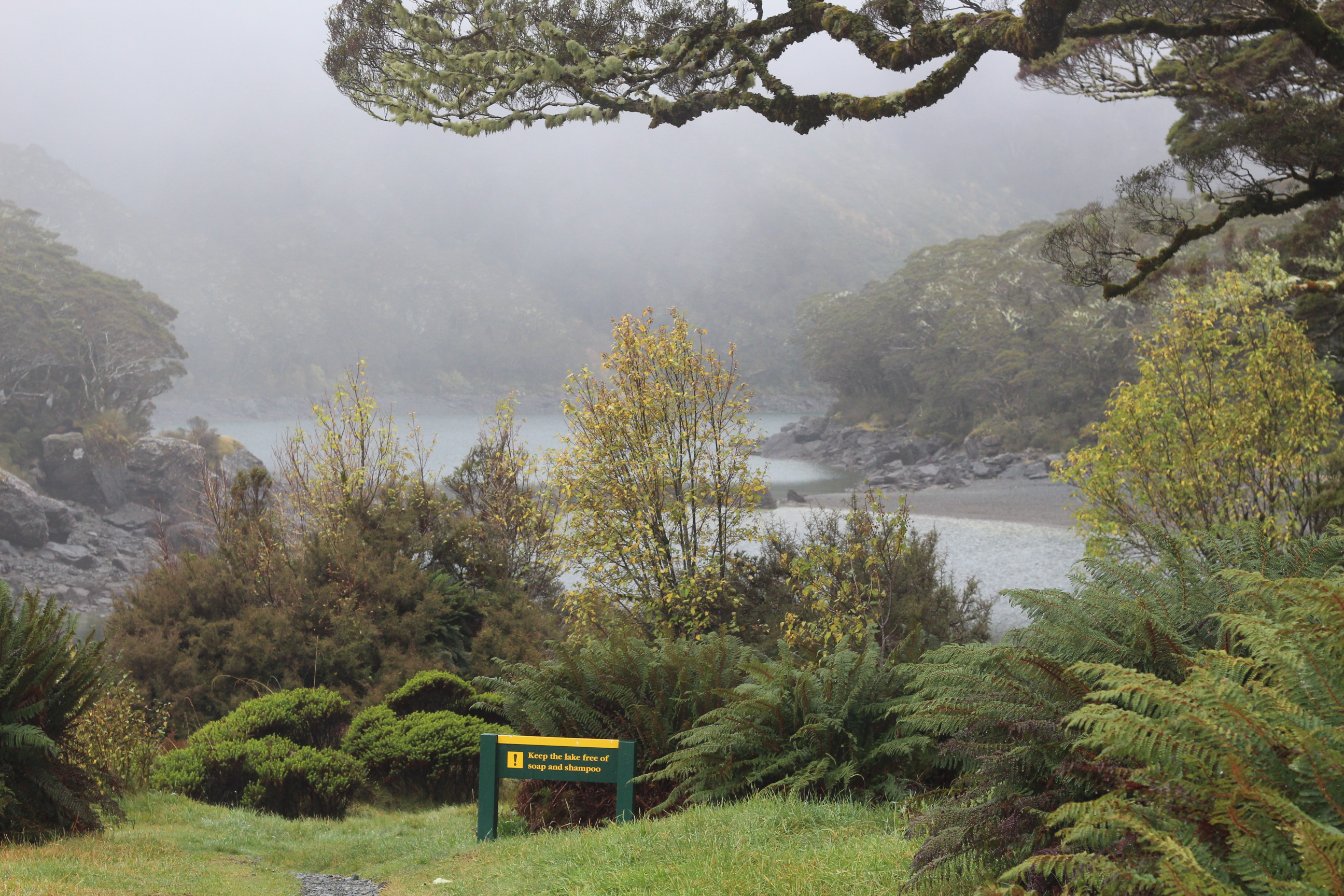 When we set out on the four hour trek to Freshwater Landing the weather hadn’t improved but we had a tail wind. I enjoyed walking through the wind sculptured scrub to the serenades of Tui and Bellbird. Mud puddles were a constant challenge to negotiate and board-walks made for easy crossings of the sedge swamps. I was lucky to see a Kiwi picking its was through a manuka patch. Around 12 noon some of us stopped in a dryish spot for lunch and were entertained by a Bell Bird preening itself.