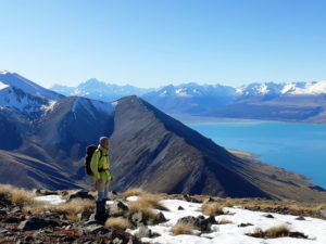 The other trip was to Ben Dhu in the Rhoboro Hills beside Lake Pukaki. This was a round trip which included negotiating almost impenetrable wilding pines and rosehip bushes by walking up a creek bed and ascending above the snowline for some fantastic views of Mt. Cook and over Lake Pukaki. A kind couple in a Juicy van gave him a ride back down the road to his car to complete the round trip and saved him riding his bike in the dark.
