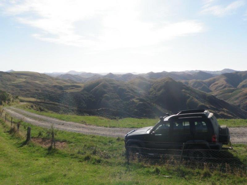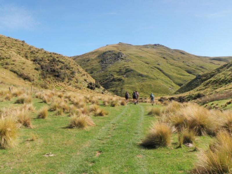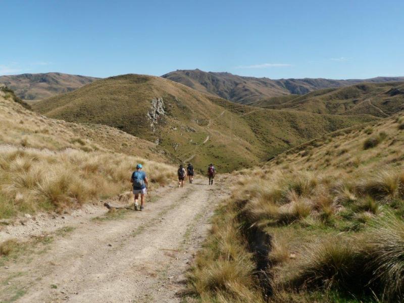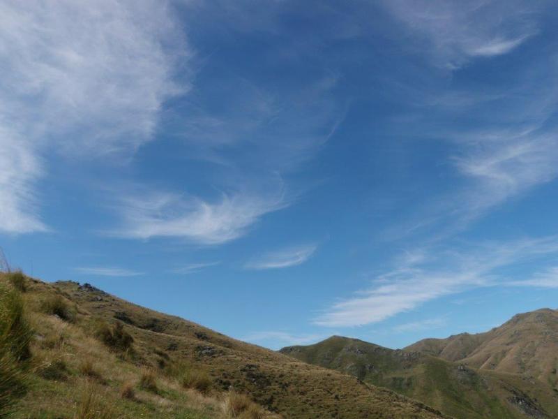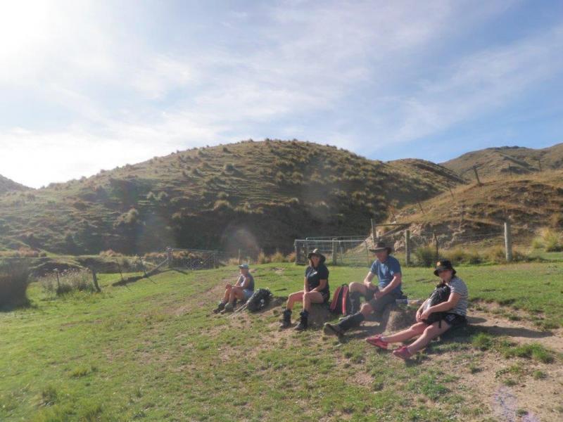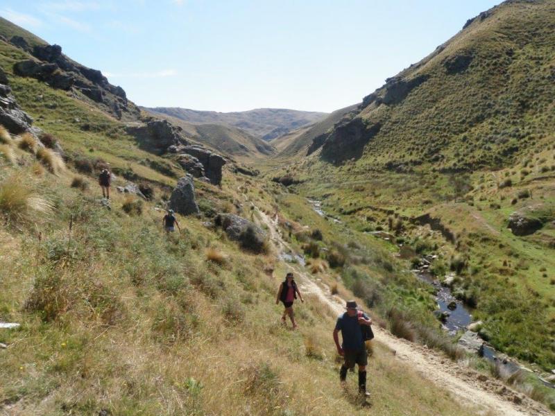 It was a perfect day for tramping: clear blue sky, warm sun, and a light nor-westerly breeze only swinging north-east later in the afternoon. The drive in was long – 97 km, 24 km of which was on gravel roads in behind Waikouaiti. Blucher Road wound tortuously along a ridge south-east from Bucklands Crossing, then turned south to become Lamb Hill Road which wound its way some more to the Bendoran Huts where it became a farm track. We parked by a gate 200 metres before the huts and, just on 10 o’clock, started walking through the gate up a short hill before turning downhill and south-west. The 4wd track we were following wound around the hill before turning down a side stream to meet Orbells Creek at the bottom. It was now 10.45 so we settled down for morning tea on a sunny bank beside some stock yards.