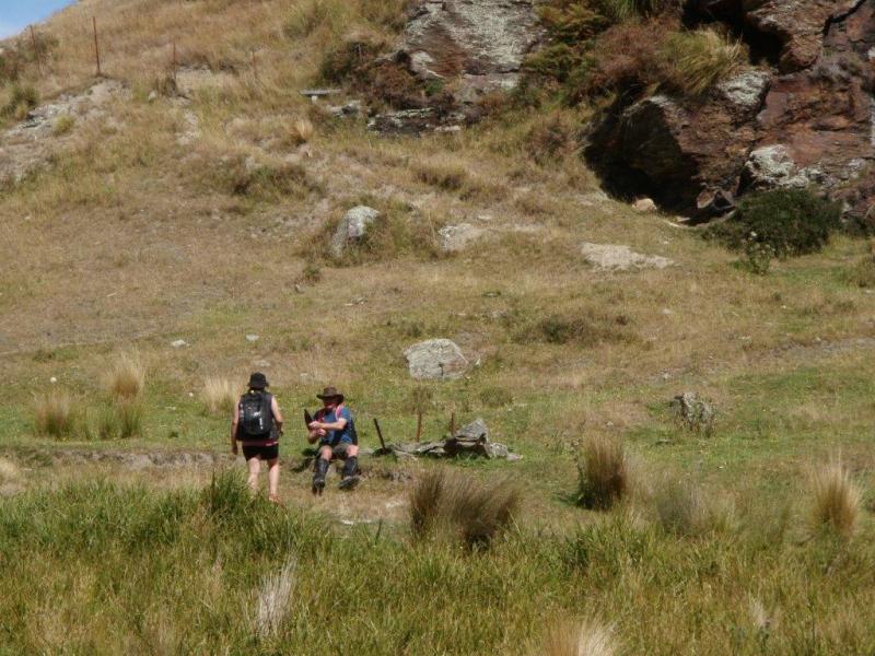 After smoko, the track followed Orbells Creek for half an hour or so before leaving it to climb 200 metres over a saddle, drop down to a side stream, then climb again to another, flattish saddle before the final descent back to Orbells Creek, which had followed a big loop to the south. Reaching the creek, the destination caves could be seen in a prominent schist rock face above the true left. A short walk down the creek, through some yards, across the creek and up a short climb took us to the caves: two large openings in the rock offering airy shelter. One had signs of occupation – an old meat safe and a clothes line. The other had a small spring which watered a small patch of lush grass. Both had clearly provided bedding for livestock, so care was needed in selecting luncheon seating.