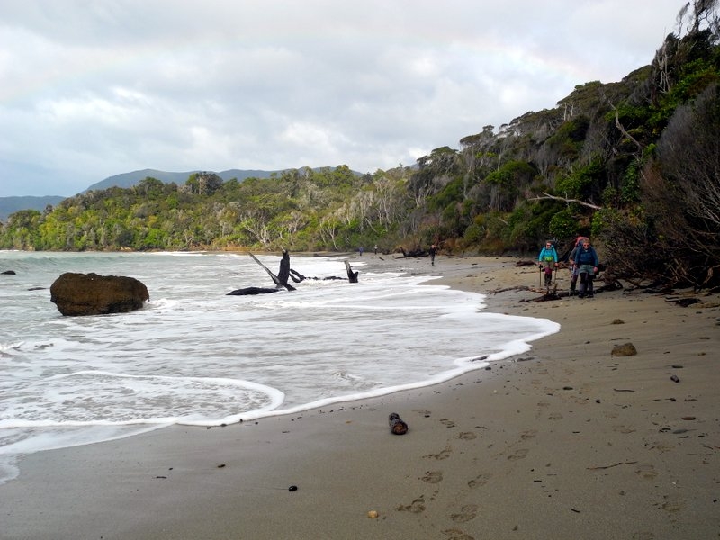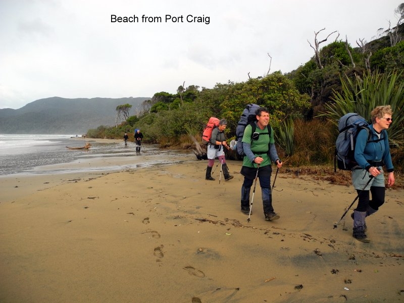 Just after 7am on Sunday we departed Port Craig and followed a well graded track to walk the 17kms to the car park. The day was fine and parkas were stashed away in the packs. At times we got glimpses of Stewart Island and the beach as we made our way through the forest up on terraces.