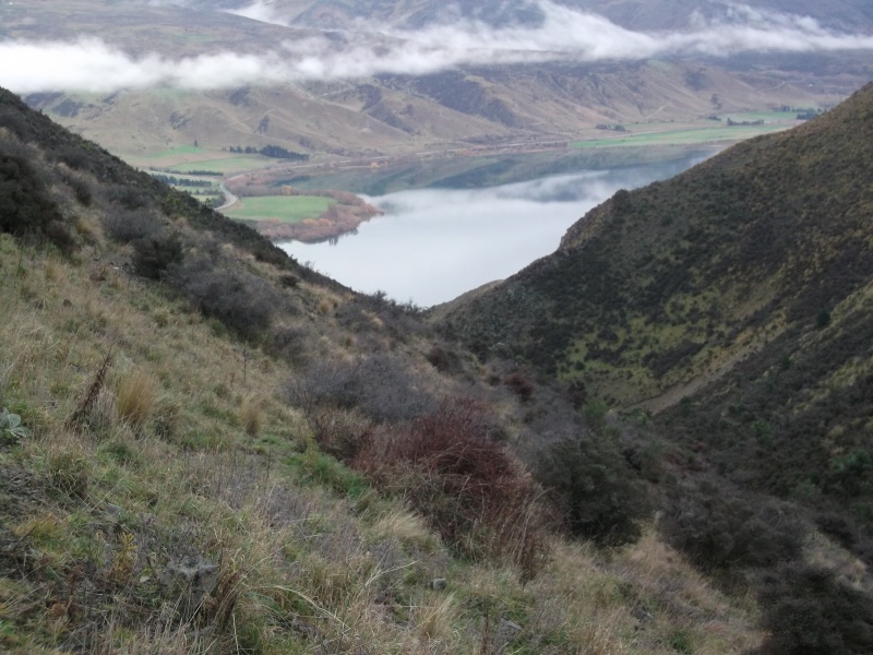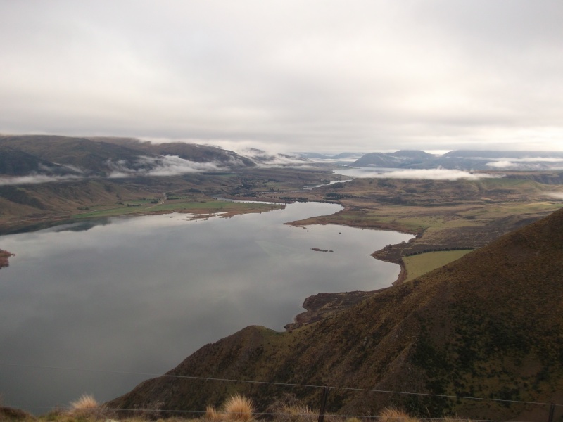 The fog had lifted a bit and we got good views of the lakes and dams, right down the Waitaki river and up the Hakataramea valley. After looking at the map and working out where Dryburgh was, we finally got to the top, which is just a high spot on the hill tops, just in time for lunch at about 12.15pm . The fog and views came and went while we were having lunch.