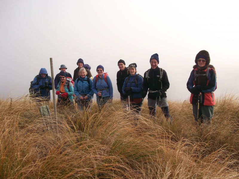 After lunch we had a photo take by the marker post and then it was off along the track heading west. By this time the fog had lifted but we still missed our turn off that was going to take us back down to the lake. It didn’t take long for us to realize our mistake and soon we were on the right track back down towards the lake.
