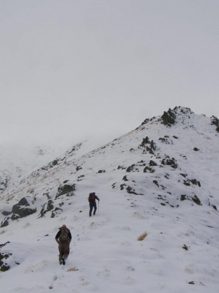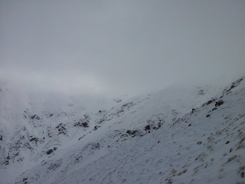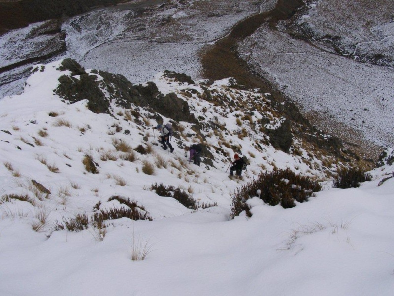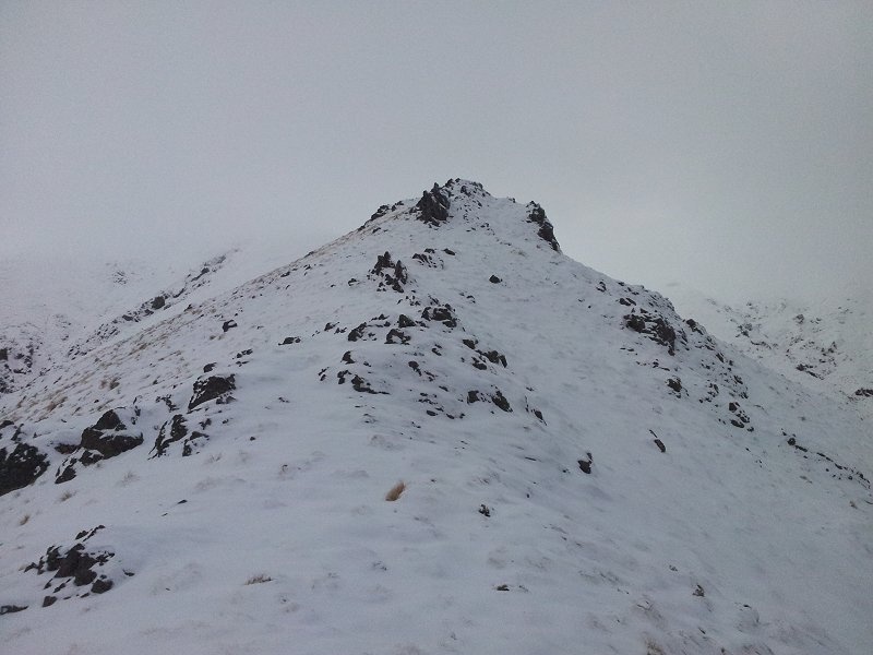 The fresh snow was boot-deep in places and knee-deep in others, dependent upon whether there was rock or vegetation underneath. However, we gained height quickly and by 12:30pm had climbed the steepest part of the spur before stopping for lunch at about 1400 metres, with just one more rocky outcrop remaining to be surpassed in order to gain access to the upper ridge leading to the summit at 1690 metres. But, stopping for lunch revealed just how cold it was without any direct sunlight, and with obvious white-out conditions waiting to envelope us as the cloud was actually lowering, common sense prevailed and so after lunch we turned around and headed back down our ascent route.