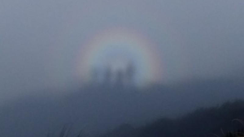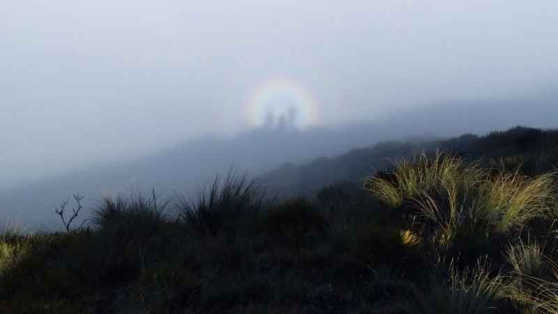We climbed up on to a rocky point and looked back down on the cloud covered Lake Ohau and there before us was a Brocken Spectre which is glory rings formed by water droplets within the cloud refracting the sunlight, similar to a rainbow. With the sun behind us we were able to get our shadows within it, a first for me.