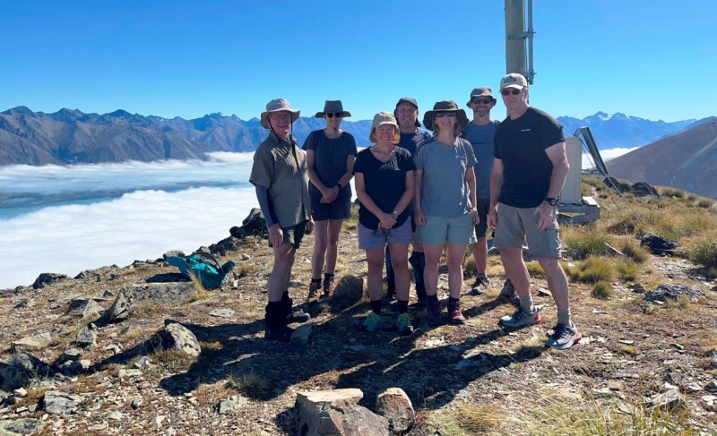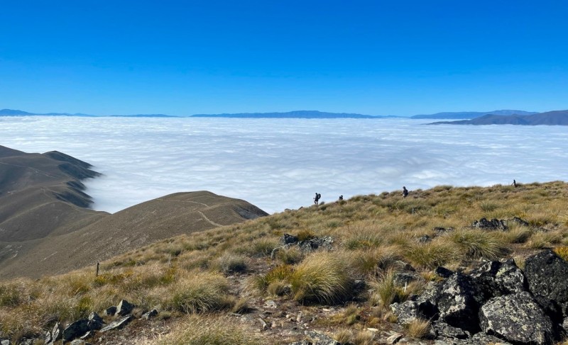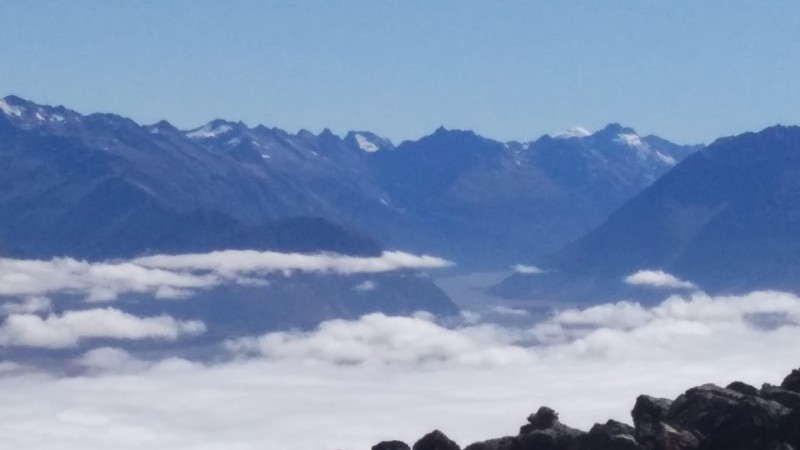 Another 45 minutes later after heading off the 4WD track at 1380m point and ascending the rocky upper northern ridge we finally reached the top 1522m at 12.15pm. We had great views of all the surrounding mountains rising up out of the clouds. Lunch was had in warm sunny conditions, photos taken and the cloud was starting to lifted over Lake Ohau but Twizel was still in thick cloud.