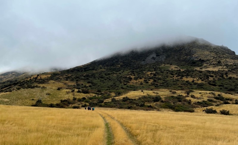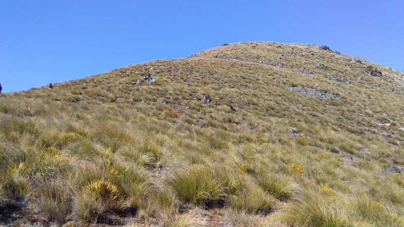 We arrived at the car park at the base of Ben Ohau at 9.30am and met our other three members. Ben Ohau was under cloud when we started off at 9.45am over the open grassy field towards the base of Ben Ohau. We soon started the climb up the zigzag 4WD track within the north-eastern gully and into the dense cloud, but after 1 ¼ hours of walking we eventually broke through the cloud into brilliant blue sky and sunshine at the 1100m mark.