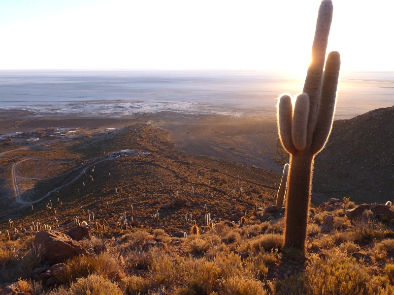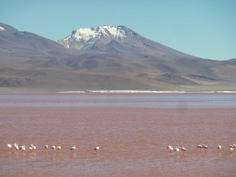 La Paz, close by in Bolivia, has a population of 2 million. From there they visited the silver mine of Potasi with 15,000 miners now producing zinc, lead and tin, and Sucre where still visible dinosaur footprints were found. The great Salt Flats of Salar de Uyuni glistened and they drove across them to an island with 2000-year old cacti. A stay in a hotel constructed of salt blocks with salt furniture was novel, and salt-edged lakes had many flamingos.