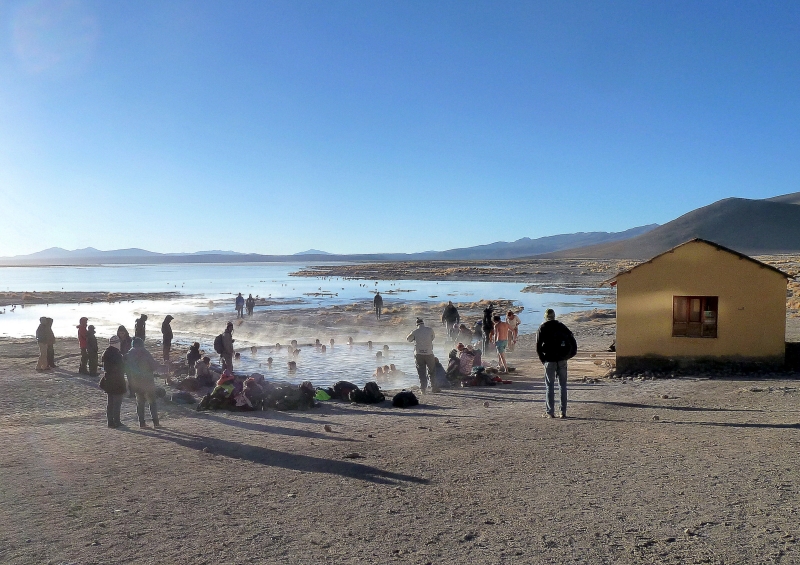 The tour ended by going up to the High Altiplano volcanic area with minus 5 degree temperature but compensatory hot pools. From the Chilean border they could see Argentina.