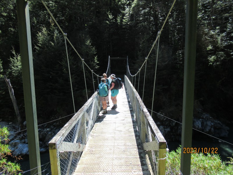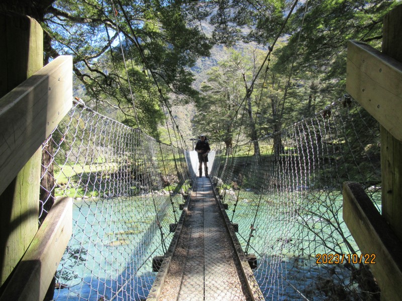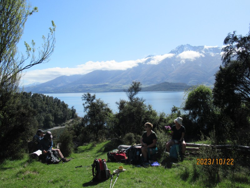 Day 2 Lake Rere: The Greenstone carpark is 30 minutes down the road from Kinloch and it was apparent by the 25 vehicles that many people were out walking. We started walking at 9.15am and soon after crossed the lower Greenstone River bridge to walk for an hour across Greenstone Station towards Elfin Bay. We stopped for a snack near what used to be a homestead, with flowering clematis, lilac and corokia. Continuing on a marked route and which was obviously a stock route was reasonably muddy in places, we were enjoying the shade of the mountain Beech. We reached the spectacular Lake Rere 12.30ish and could see a clearing at the other end which the Boss (me) decided would be a good lunch spot. After the lake, the track descended gradually down towards the upper Greenstone River bridge to link up with the Greenstone Track. A couple of hours later, we came to the Greenstone/Caples Track junction. Jenny and Lois had shot ahead so they could walk up the Caples Track for a while and returned to meet us at that junction. After passing some waterfalls along the track, we met up with Graham back at the carpark about 3.30pm. We did this track at a leisurely pace as it was a beautiful place to be for the day, remembering Lake Rere was a popular tourist destination for Victorian ladies in the 19th century. There were many groups going both ways and to avoid the hot afternoon sun, clockwise would be my pick. Driving back to Kinloch, there is an amazing view of Mt Earnslaw which John captured. A quick shower, drinks at Jenny and Grahams and then over to the restaurant for dinner – not hard core trampers.