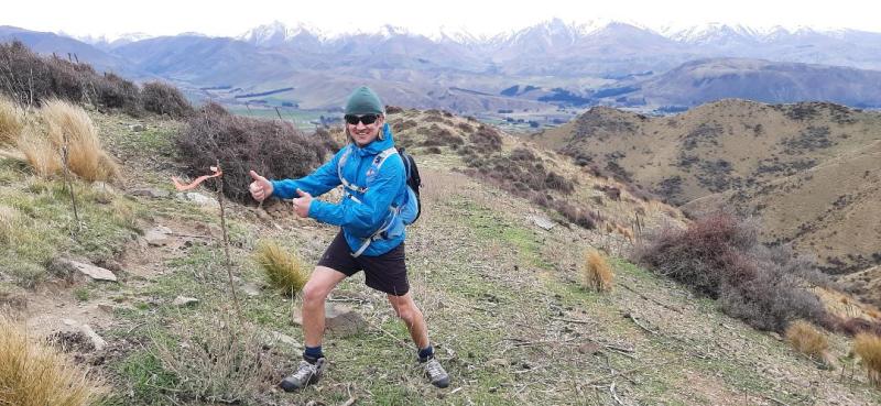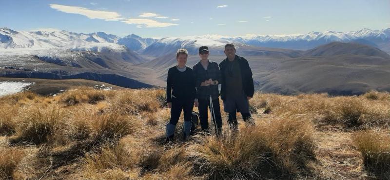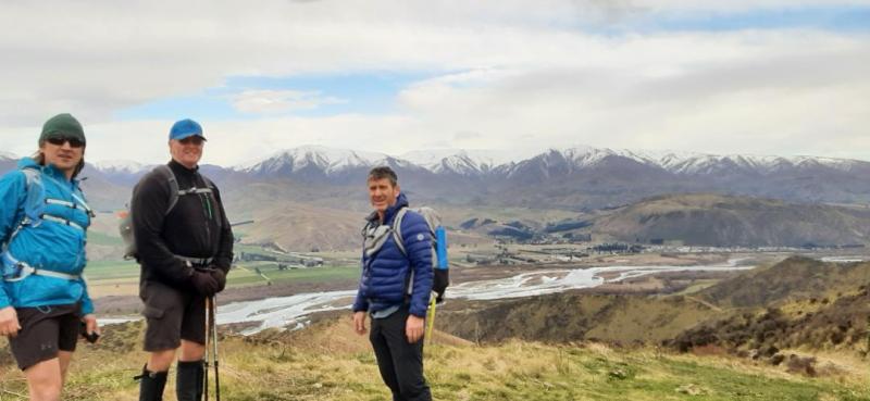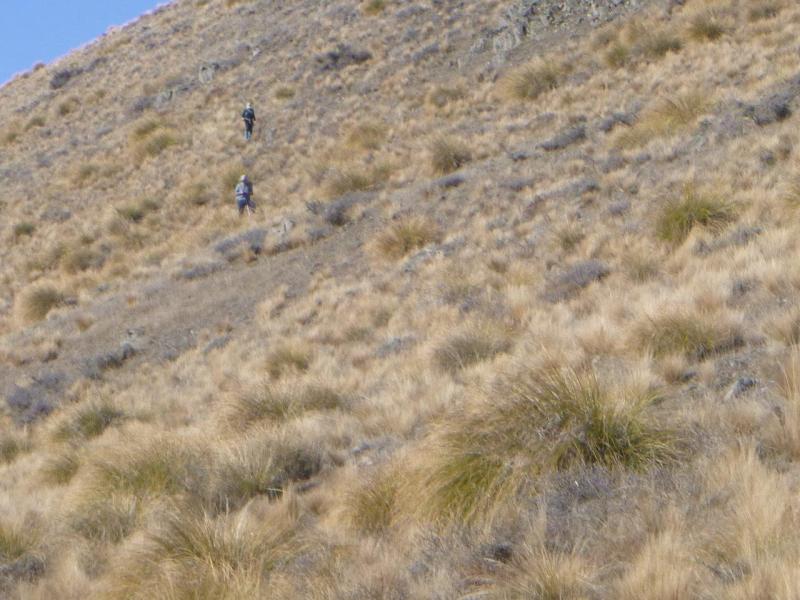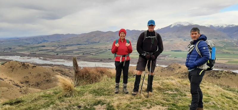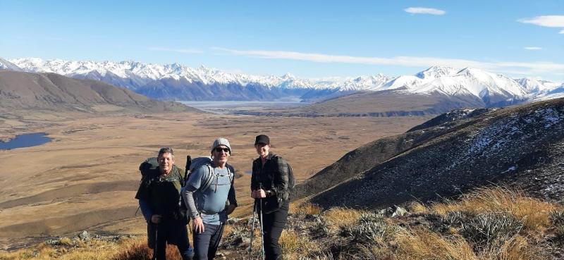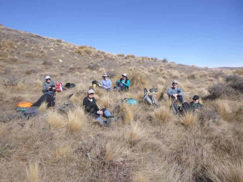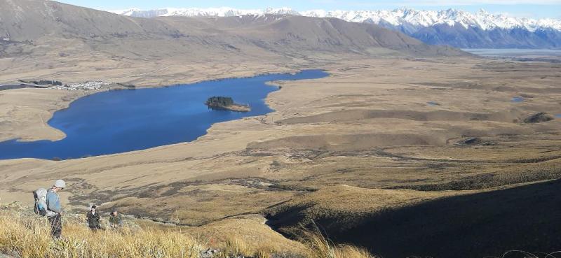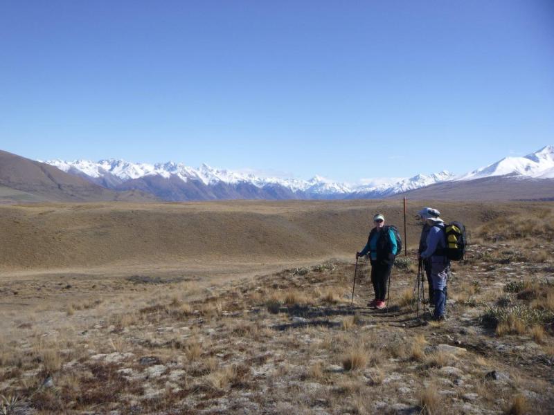 The 2km climb up Mt Guy is short and intense, going straight up to the summit. The 4km from the carpark took us about 2 hours. From the top (1319m) the view is immense and magnificent, looking from the sea to the Taylor Range, across to the Arrowsmiths, the Rangitata River, the Southern Alps with Mt d’Archiac towering high, and down to Lake Clearwater. A breathtaking spot to eat lunch! The snow was low and glittering, the tussocks golden and the sky clear blue. From here we headed down the northwest ridge for 4km to meet up with the other group lunching at the saddle where the Te Araroa trail crosses between the Dog Range and Mt Guy. (Thanks to John and Neville on their radios, we knew exactly where to find them!)