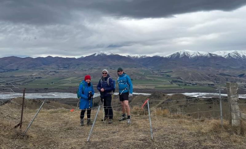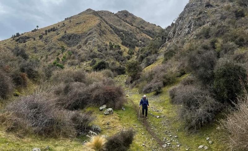 We didn’t linger for long in the freezing winds and set off down the access road to the top of the steep gullies heading back down towards the Waitaki River. We were searching for the orange tracking tape that Neville had tied to a Taranaki gate at 650m. Neville was determined we would not get lost, and we duly found three tapes fluttering in the wind, guiding us down a 4WD track and the steep descent to large groups of flowering kowhai trees growing in the gully, before coming out to the carpark. The trip down took one and a half hours.