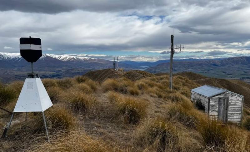 With a cold nor’west wind blowing off nearby snowy peaks, three of us huddled behind tussocks to eat lunch, while Rodney ventured into the wind to check out the trig and collection of masts and sheds that are scattered over the summit.