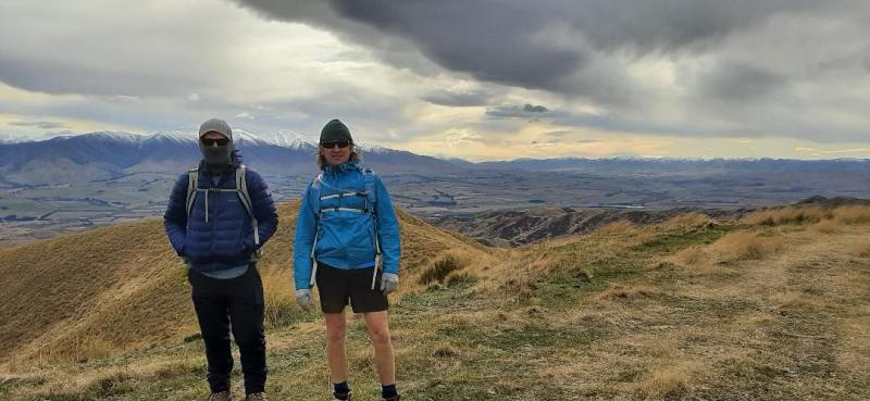After a morning tea break, we continued up the farm track until we reached the crest of the range, joining the Station Peak access road with views out to the Hakataramea Valley, bordered by the Kirkliston Range, and the Hunters Hills. Following the road, we reached Station Peak (885m) summit two and a half hours after leaving the carpark.