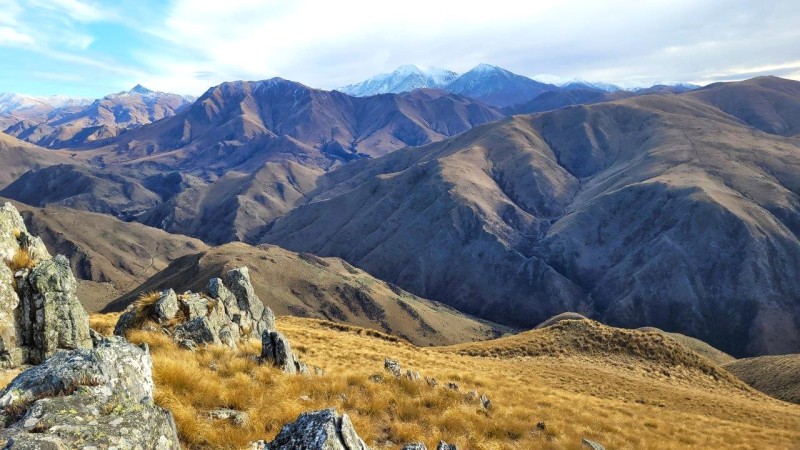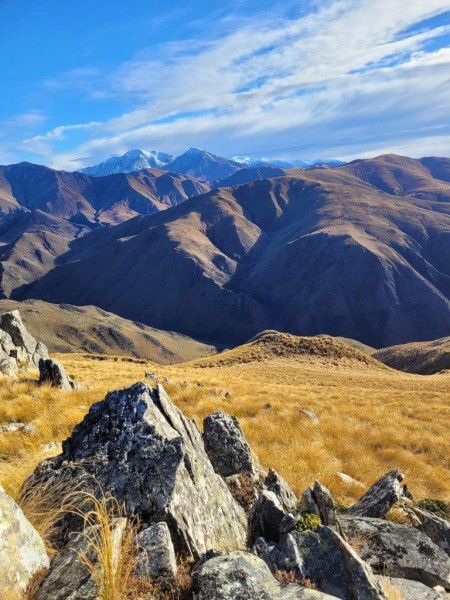 As it was such a nice day a leisurely lunch was taken with amazing 360 degree views of the coast, the Kakanui Mountains of Mt Dasher, Mt Evelyn, Kakanui Peak and Mt Domett in the distance, right through to the mountains around Queenstown.
