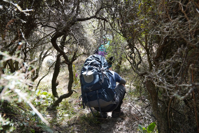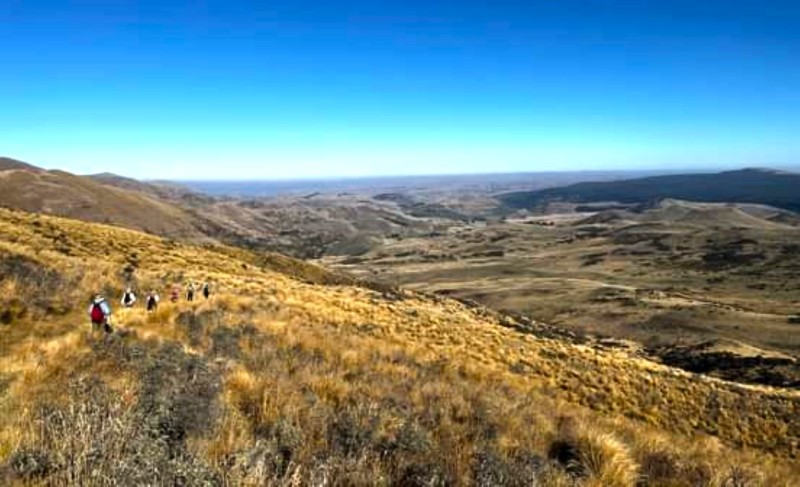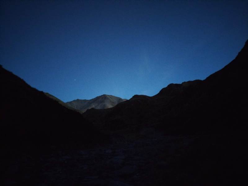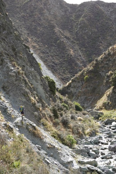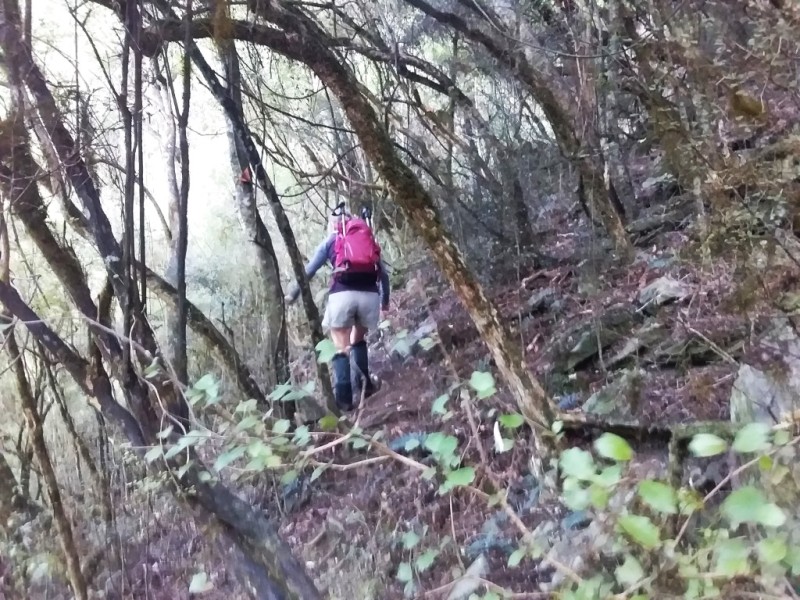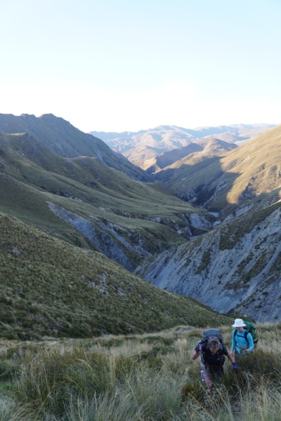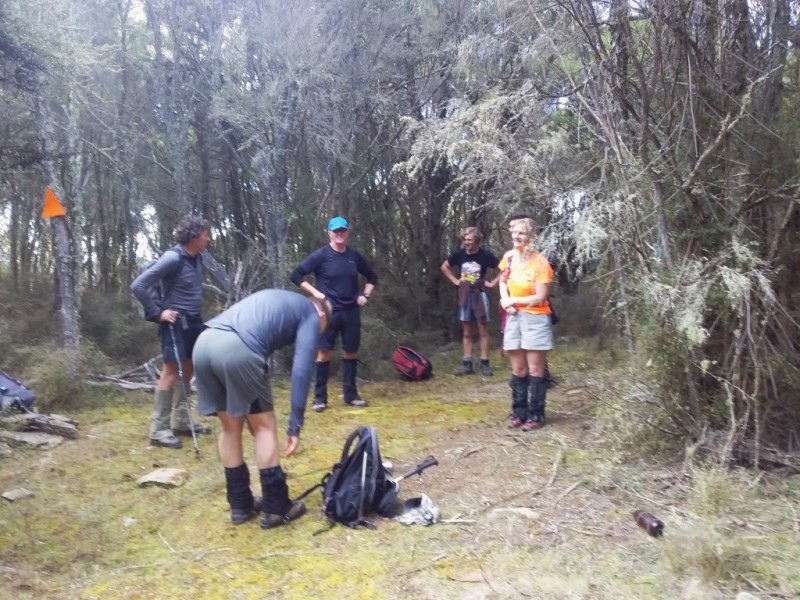 A nice warm evening and pleasant setting with a game of 5 Crowns to finish off saw everyone in bed by 9. The following morning an early wakeup at 5.30 got us off to start walking up the river to the start of the uphill section at the head of the valley. The leader had to send his merry crew off up the hill at this point on their own, owing to his decrepit boots. He anxiously tried to follow their progress with the aid of binoculars but after just a short while failed there too as the crew disappeared from sight.