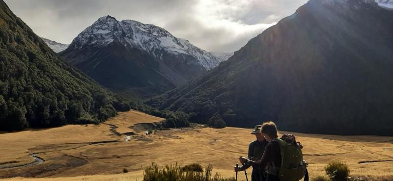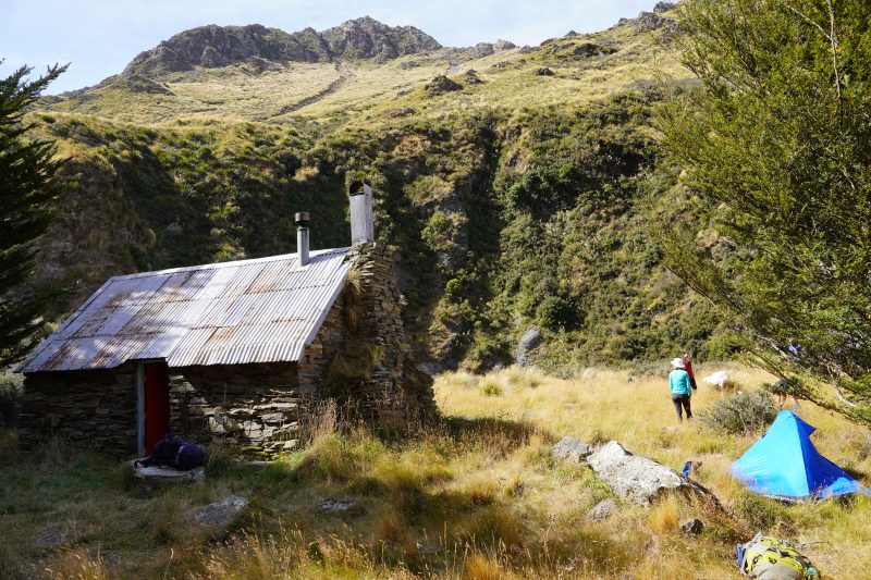 Top Dingle Hut is well worth a visit: a small 1963 hut with 6 bunks, fireplace, stainless steel bench and bespoke table and stools. Surrounded by beech trees, catching the afternoon sun, looking out over the Dingle Burn to mighty peaks above, it is a place to linger. After settling in with hot drinks and afternoon tea, we spent the sunny late afternoon collecting firewood from the forest, then settling in for a game of Five Crowns by the blazing fire.