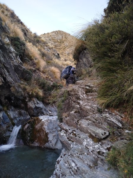 Seven trampers turned out for this walk which does have quite strenuous climbs in it. It was a fine chilly morning as we set off down the hill to the Middle Branch of the Waianakarua River. Birdsong was unusually loud and the big descent was undertaken in good spirits. We had been joined by two younger potential members so some observation was required to see if they were going to be ok going up the Staircase ridge. As many members will know, the river part of this trip is particularly slippery at this time of the year, but luckily there had been no frost and fairly dry conditions meant it wasn’t too bad.