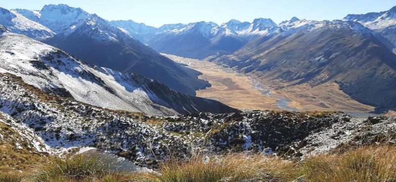 Robbie drove us right up to the Dingle Burn Track carpark, and the three of us headed off up the track at 11.30am. We reached the saddle by 1pm, having lunched lower down to shelter from the freezing wind blowing off the snowy peaks. Then we headed down the steep ridge to the Dingle Valley below, reaching Top Dingle Hut soon after 2.30pm.