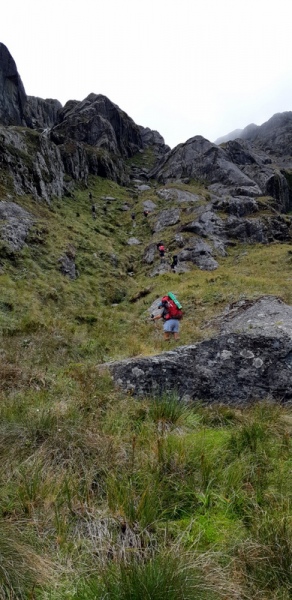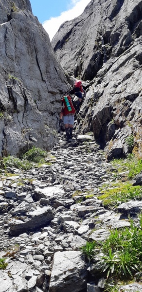 About a third of the way up a rock step has to be negotiated, requiring a pack haul for some with shorter legs. Once above the rock step more up and then into a narrow gut which is often filled with snow before finally emerging out for our first views of Lake Wilson and its magnificent surrounds.