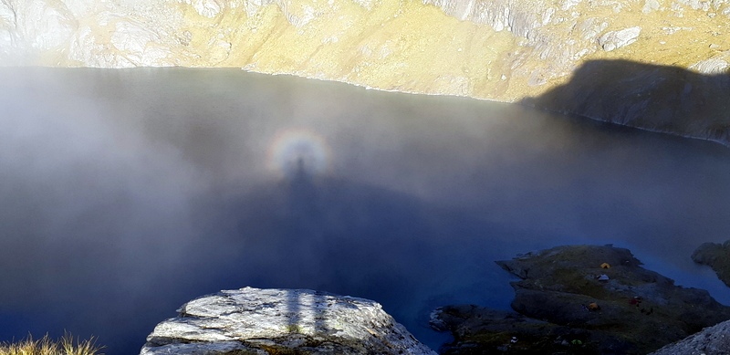 The afternoon was spent relaxing in the stunning surroundings with a brew of choice in hand. As the sun dipped behind the ridgeline surrounding our camp, some of us took the short climb to once again be in the sun and enjoy the sunset along with a Broken Spectre effect.
