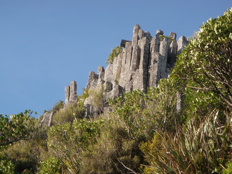 Lunch over, we set off at 1 o’clock back down to the track junction where we took the east branch. This headed gently down into a saddle, past Buttars Peak and reaching the famous Organ Pipes after about half an hour’s walking. As we sat admiring the standing basalt columns of the ‘pipes’ high above us, we speculated about what had brought down the many pipes in the jumble where we sat and the chances of more falling on us.