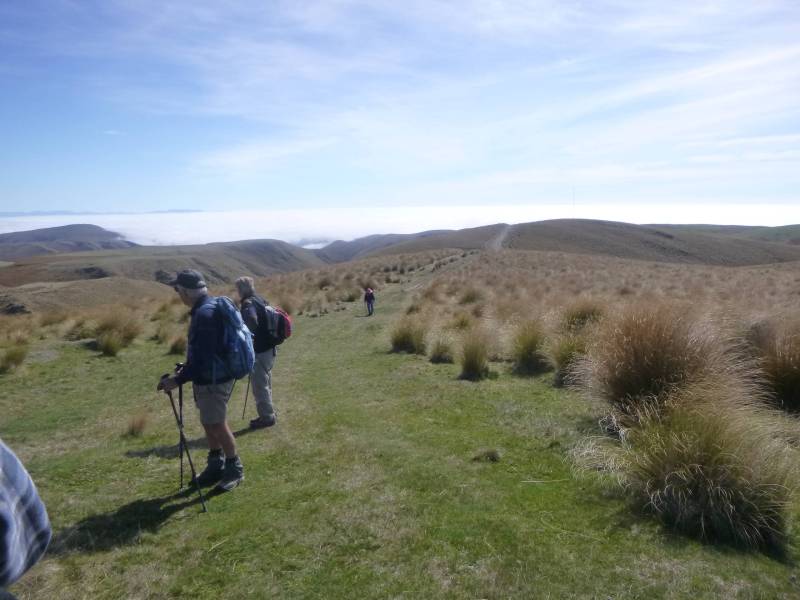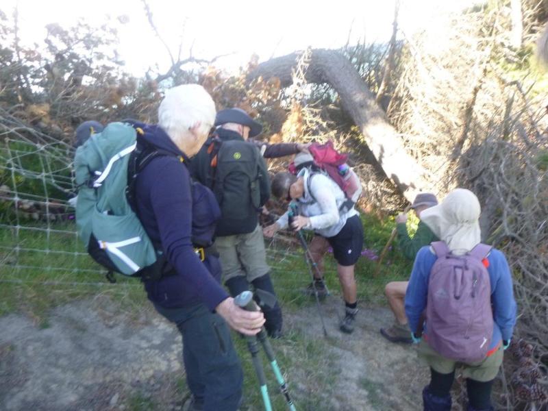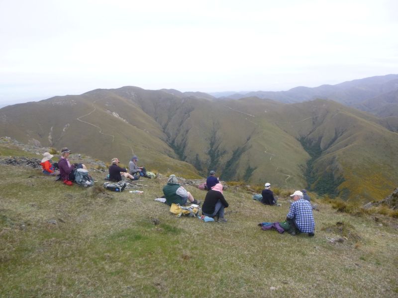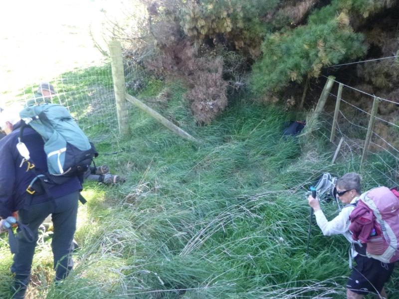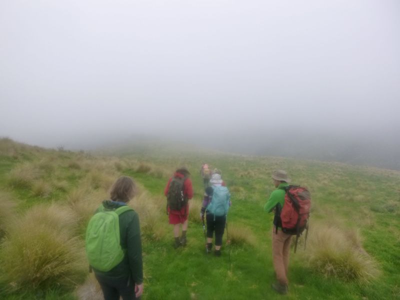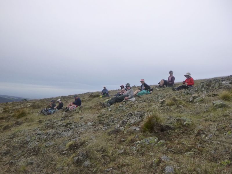 Time was taken to consult maps, compasses and memories before deciding to head down the north side of the hill shortly after 1pm. This took us over less rocky terrain than the ascent, though still requiring care. At one point we struck a barren rock field, which some navigated through and others skirted above. This was followed by a pleasant stroll through tall tussocks. By now the weather was clearing and we could see where we were heading! We then reached a fence with two electric wires which seemed pointless (it seemed to have only one end), but had to be crossed before we could head down the boundary fenceline and across the gully we had traversed in the morning. On the other side, rather than continue up the fence, we headed left on a grassy track which sidled up with fewer obstacles. Shortly we were on a well-formed track which took us back at the gate at around 2.30pm.